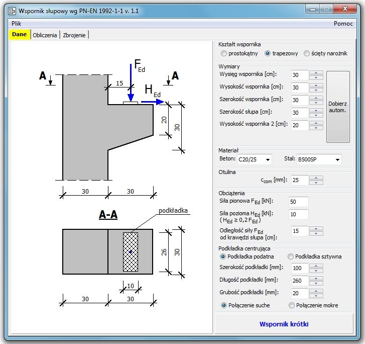 - podgląd w czasie rzeczywistym modelowania wspornika (wymiary, zbrojenie, schemat obliczeniowy)